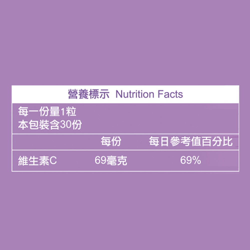 成分:微結晶狀α-纖維素、麥芽糊精、維生素C(抗壞血酸、玉米澱粉)、櫻花萃取物(麥芽糊精、櫻花萃取物、抗壞血酸、DL-蘋果酸)、綜合莓果萃取物(蘋果、草莓、葡萄、覆盆莓、藍莓、山桑、蔓越莓、櫻桃、野櫻莓、桑椹、黑加侖、黑莓、楊梅、接骨木莓、麥芽糊精)、二氧化矽、硬脂酸鎂、玫瑰花瓣萃取物(玫瑰花瓣萃取物、糊精)、穀胱甘肽、玉米胚芽萃取物(含神經醯胺;糊精、玉米胚芽萃取物)、燕窩萃取物(糊精、燕窩萃取物)。