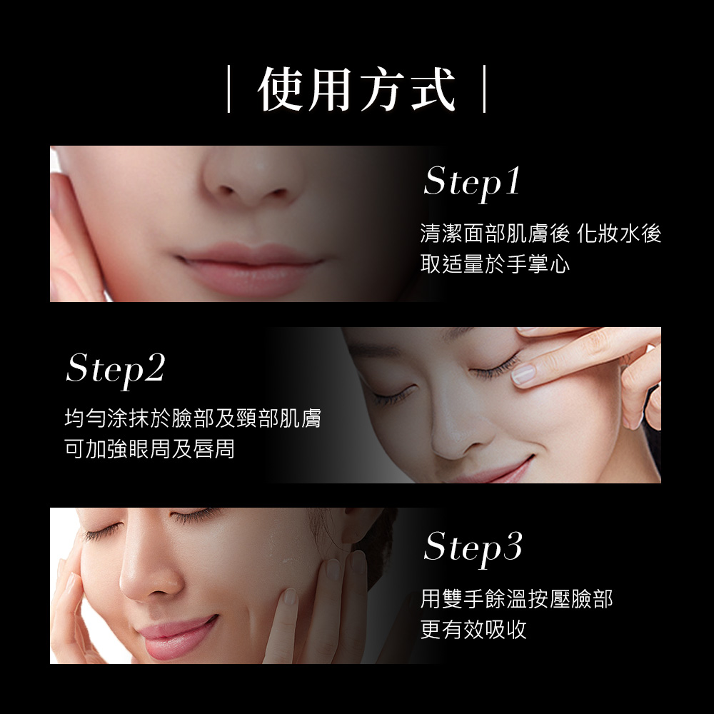 使用方式:每日早晚使用,臉部洗淨後請取適量塗抹於眼部,臉部及頸部肌膚,可加強眼周及唇周,充分滋潤肌膚。