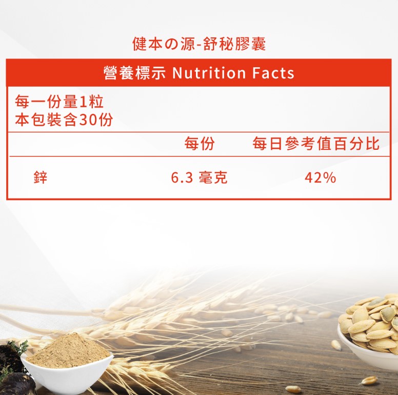 成分:南瓜籽萃取物(南瓜籽萃取物、麥芽糊精)、L-精胺酸、諾麗果濃縮粉、葡萄糖酸鋅、余甘子萃取物、微結晶狀α-纖維素、硒酵母、黑麥花粉萃取物(微結晶狀α-纖維素、麥芽糊精、花粉萃取物、磷酸氫鈣、葡萄糖酸鈣、二氧化矽)、黑馬卡粉、二氧化矽、硬脂酸鎂 。